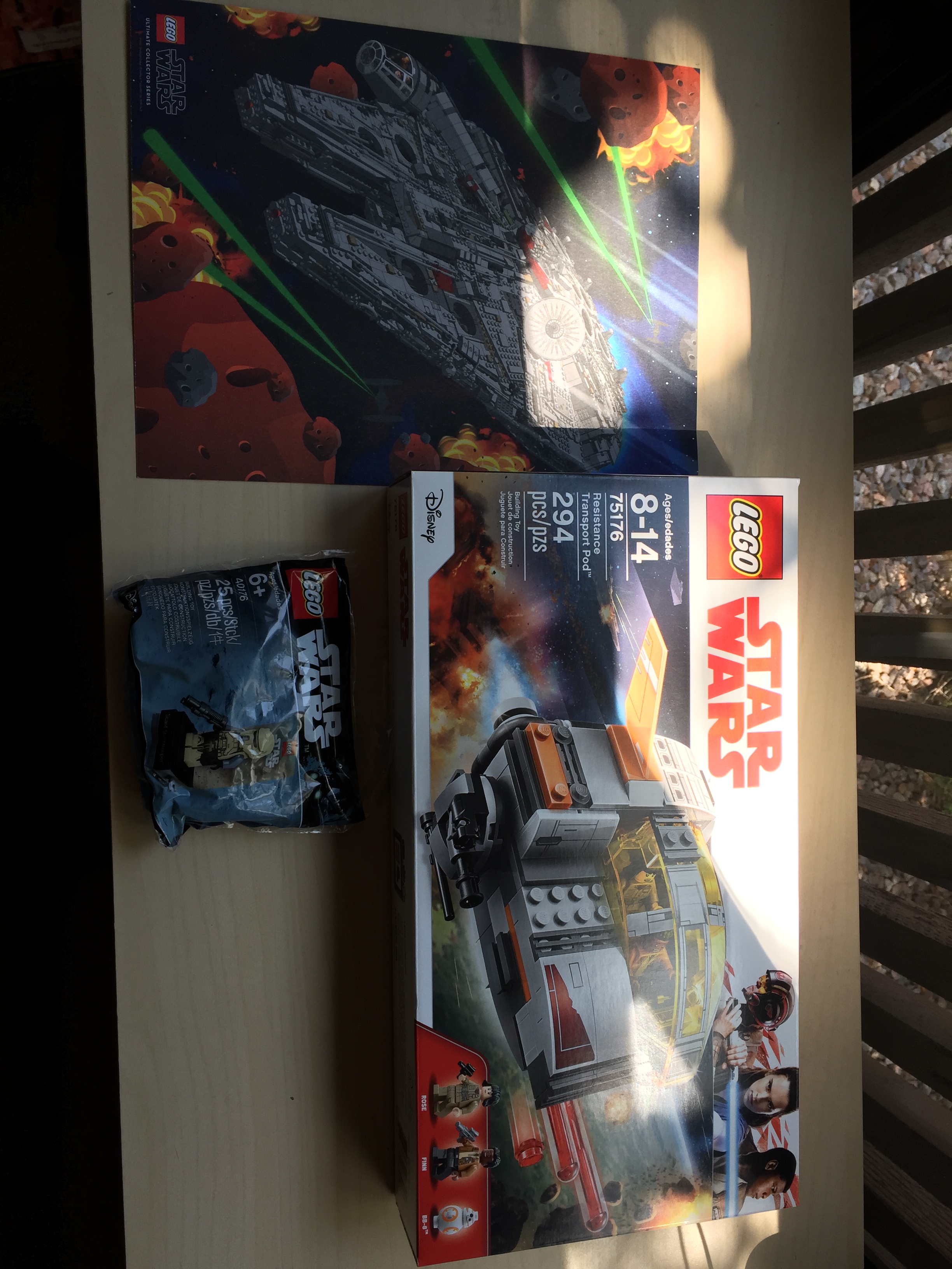 We ended up buying a few kits to work on this weekend! The only Episode VIII one I picked up however was the Resistance Transport Pod with Finn, Rose and BB-8 minifigs. We each also got some freebies here, in the form of a cardstock print and a Scarif Stormtrooper fig!