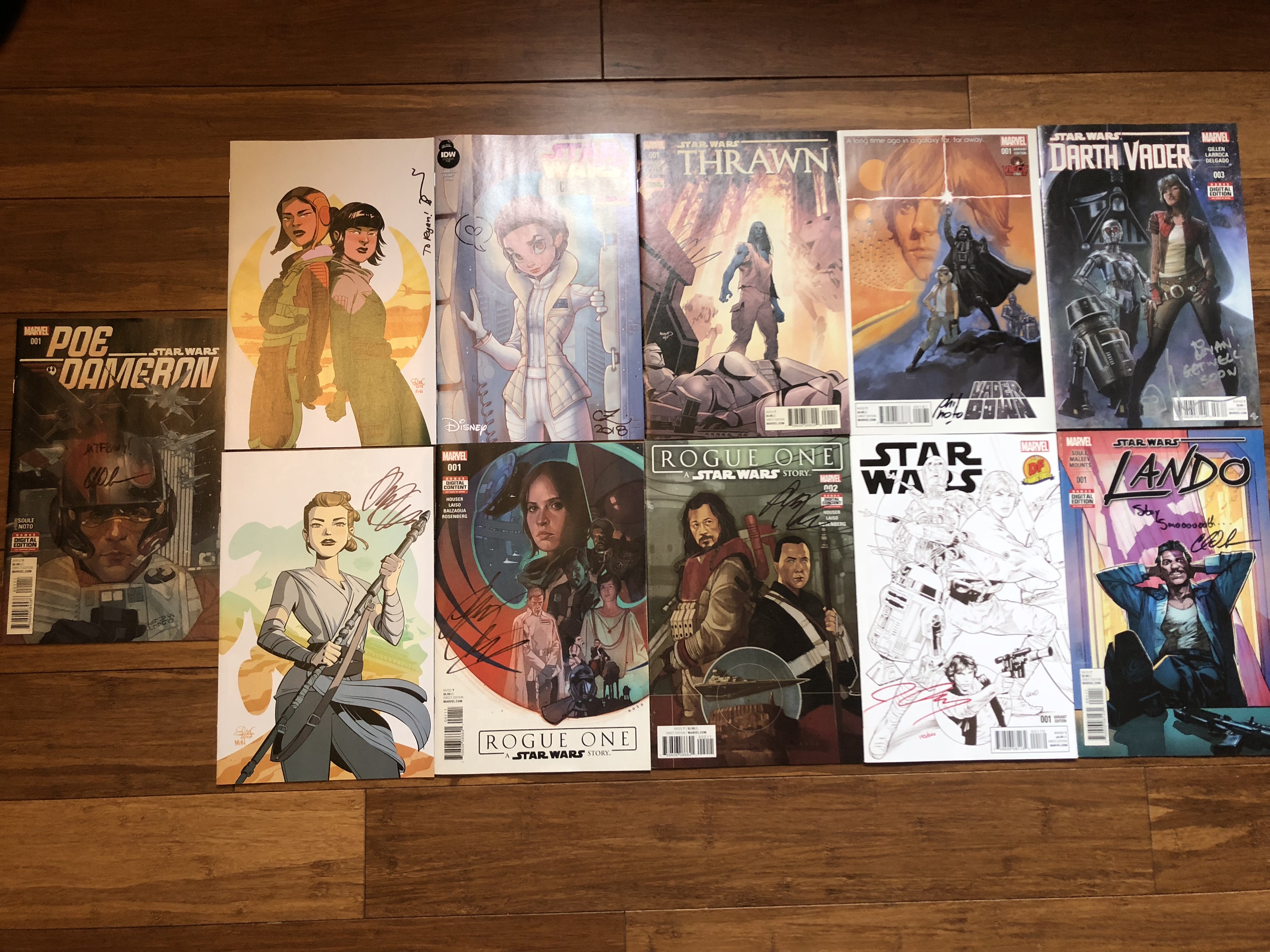 After the Disney deal went through and the canon “rebooted,” I made a commitment to start fresh collecting Star Wars comics in earnest. I had a handful of original Marvel books and kept up with the Dark Horse titles for a few years, but I was never fully able to catch up (same with the novels, etc.). The continuity reorganization gave me a fresh starting point and as of this moment I’ve read pretty much every Star Wars comic published since the change. I love what Marvel, IDW, and the Lucasfilm Story Group have been doing with the comics, bringing in some of the absolute best talent in the industry to tell great stories that compliment the films. I’ve been fortunate enough to meet some of this talent at various conventions over the past few years, and it has been great to be able to let them know how much I appreciate the work they’ve been doing (and to get signatures for my collection). So that’s what this post is all about, just sharing the books I’ve had signed and my appreciation for the creators.