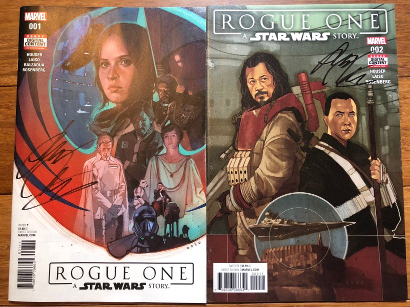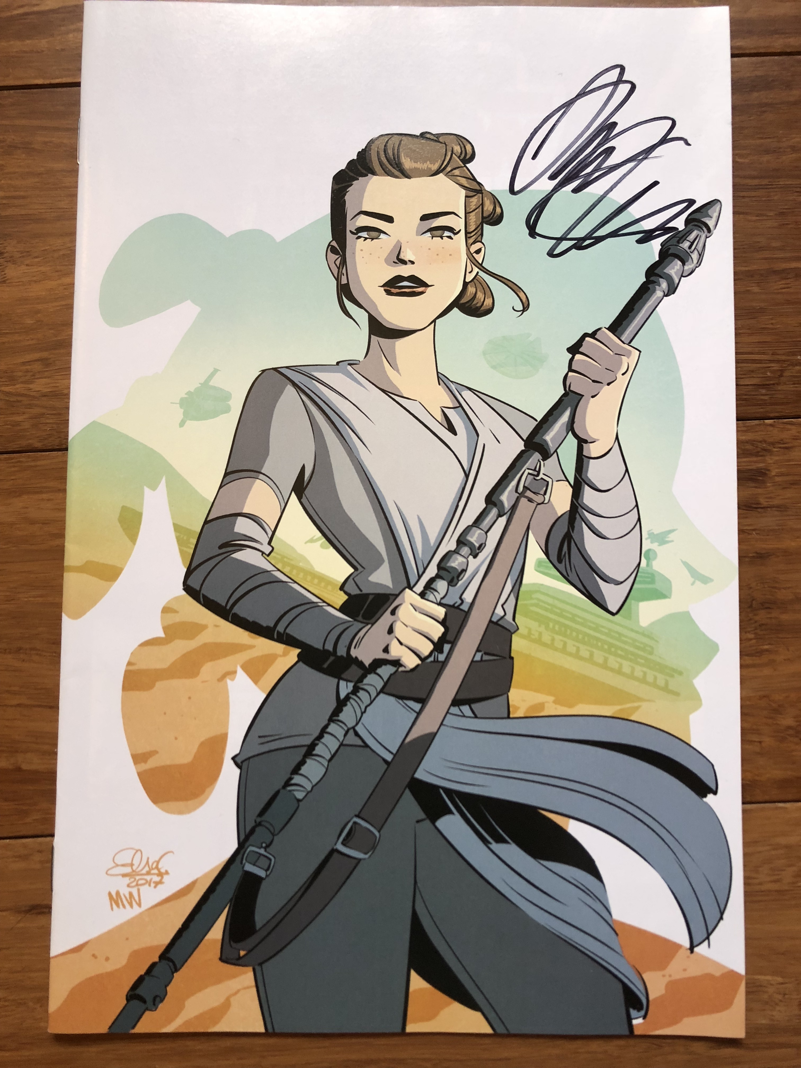 Jody is the creator I have the most books signed by. My first exposure to Jody’s writing was through Mother Panic (a dark, Batman-adjacent story under Gerard Way’s Young Animal comic line). She has adapted Timothy Zahn’s recent Thrawn novel and Rogue One for Marvel. For IDW, she did a Forces of Destiny Rey issue (the textless cover I have is part of a set of convention exclusives you can get from IDW’s booth). Like all Forces of Destiny stuff, it’s super fun and awesome. Something cool about visiting Jody’s booth at a con is that she cuts up her comp books and makes jewelry out of them. I bought a sweet Krennic keychain from her at DCC this year!