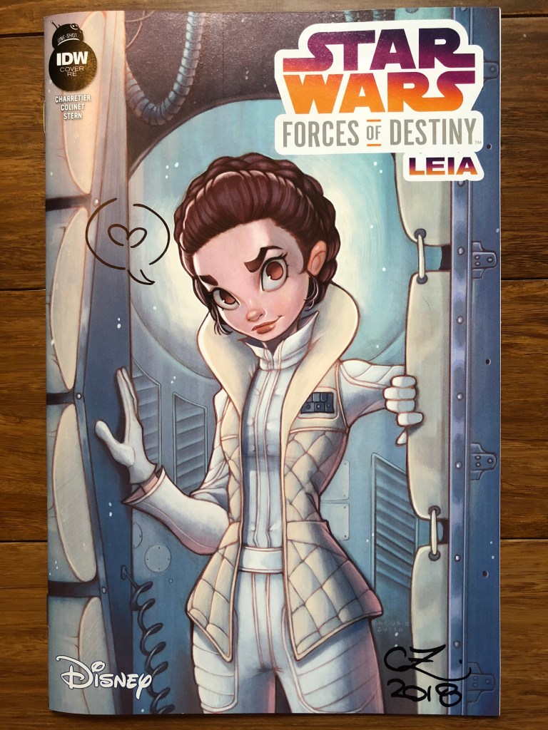 My wife and I are both huge fans of of Chrissie’s art and have multiple prints of hers hanging throughout our apartment (including Rey and Leia). When I found out that she was doing a limited run Forces of Destiny cover for Hall of Comics, I ordered it immediately. I was stoked to be able to get it signed at her booth this year!