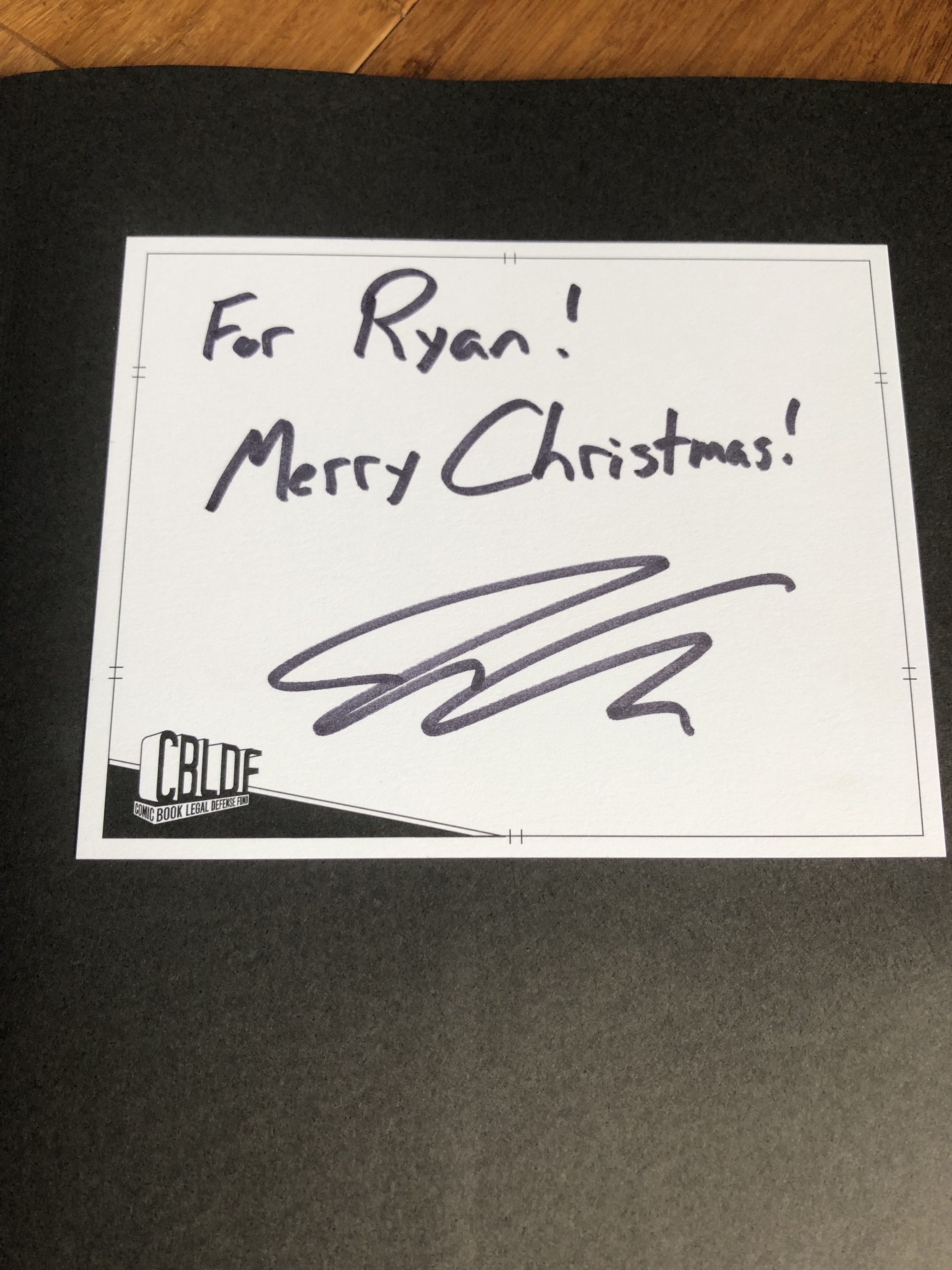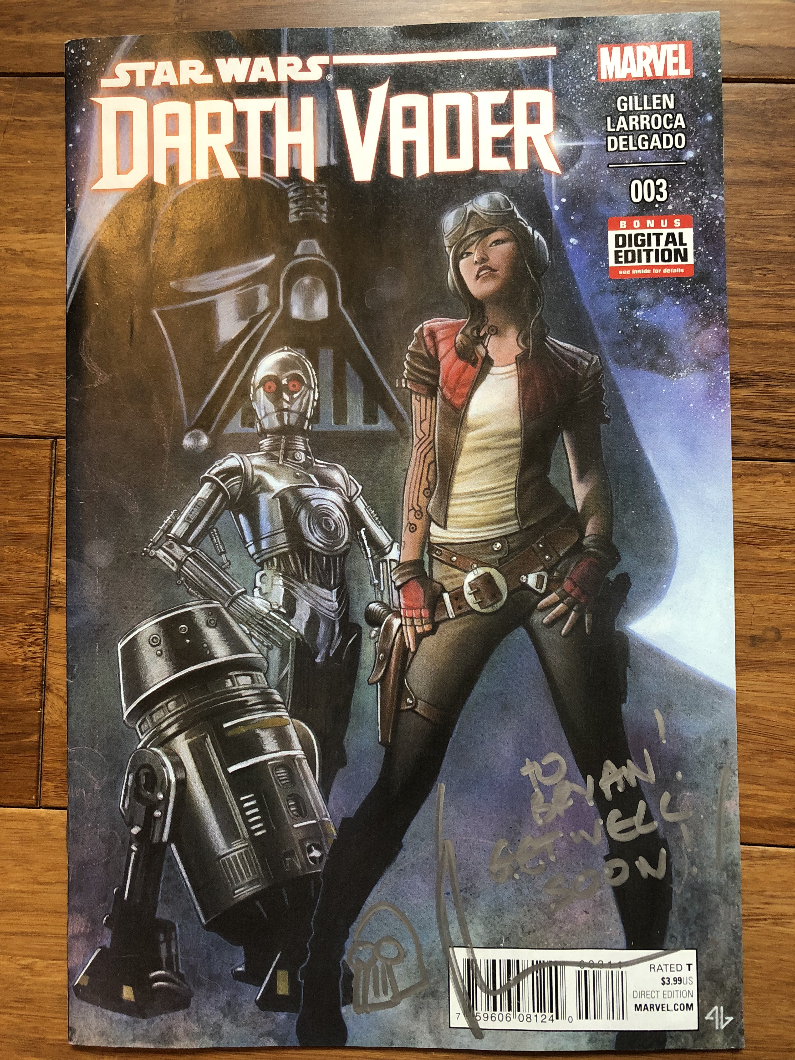 If you’ve ever listened to an episode of our podcast where we talk comics, you’ll know I LOVE Doctor Aphra. So needless to say, I was incredibly excited to learn that her creator, Kieron Gillen, would be at my local comic con. Unfortunately, that weekend I was down in bed with a 102 degree fever. Luckily, my wonderful wife was happy to go in my steed and get Aphra’s first appearance signed for me. I’m pretty sure the “get well soon” message here instantly healed me (even though he heard my name as Bryan) (it’s Ryan).